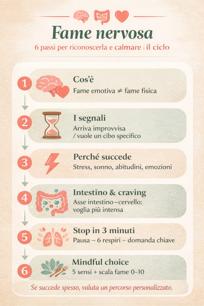 La fame nervosa è il desiderio di mangiare spinto più da uno stato interno (emozione/ansia/noia) che da un bisogno energetico reale.