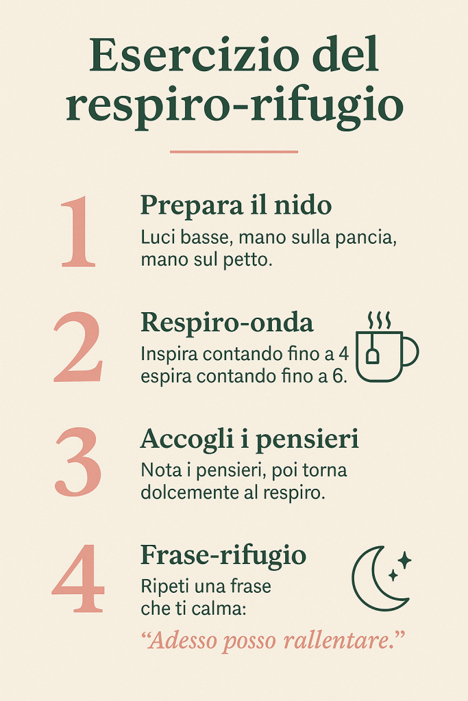 Questa sera, prima di prendere il telefono, prova l’esercizio del respiro-rifugio per qualche minuto. Non deve essere perfetto, deve solo essere tuo.2. Chiedere un sostegno personalizzato