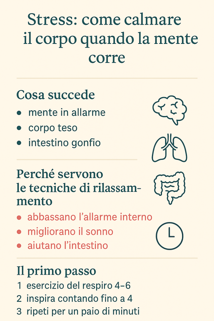 Voglio solo spiegarti perché le tecniche di rilassamento non sono una moda, ma un modo concreto per aiutare corpo, mente e intestino a tornare dalla stessa parte.